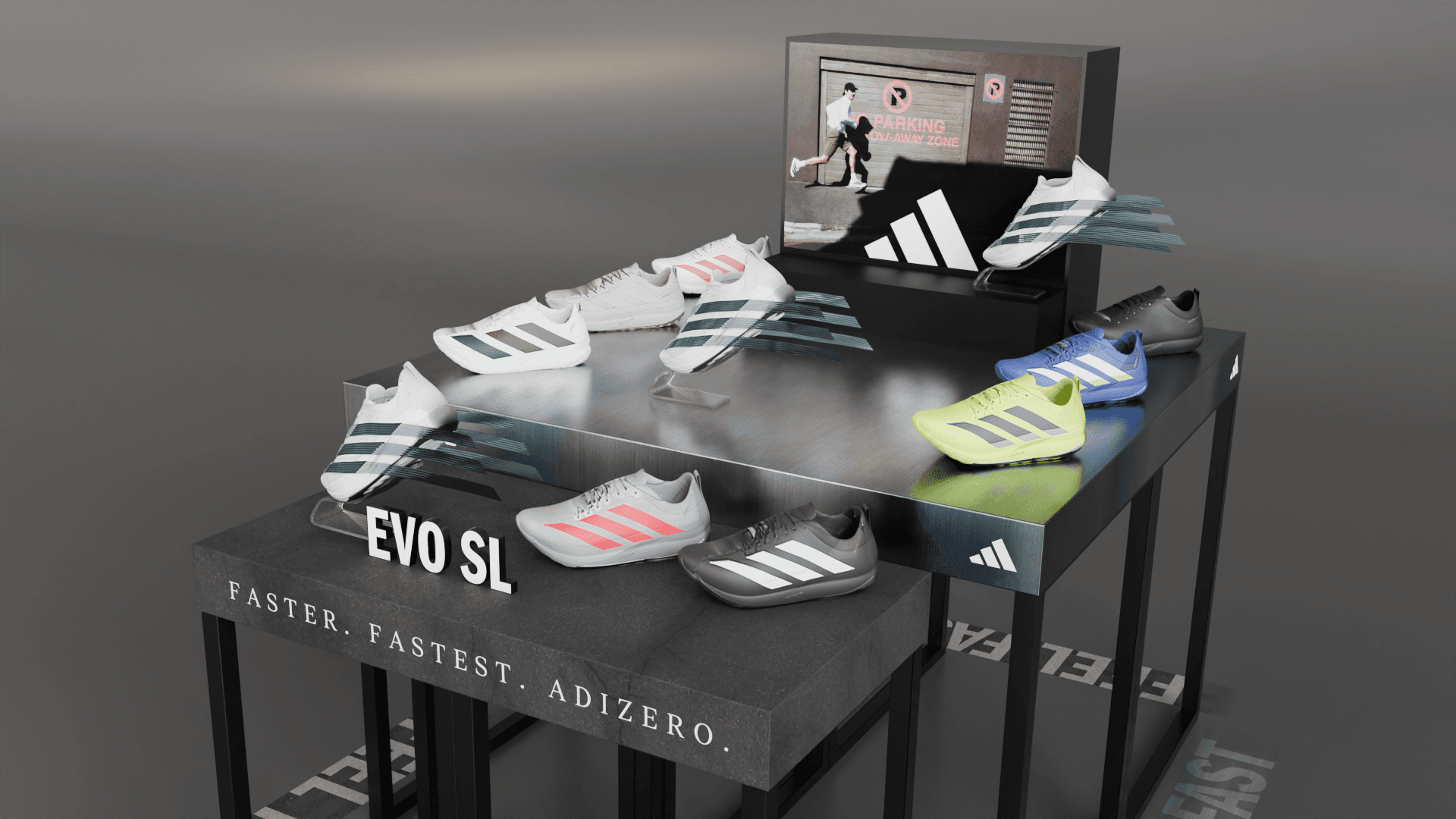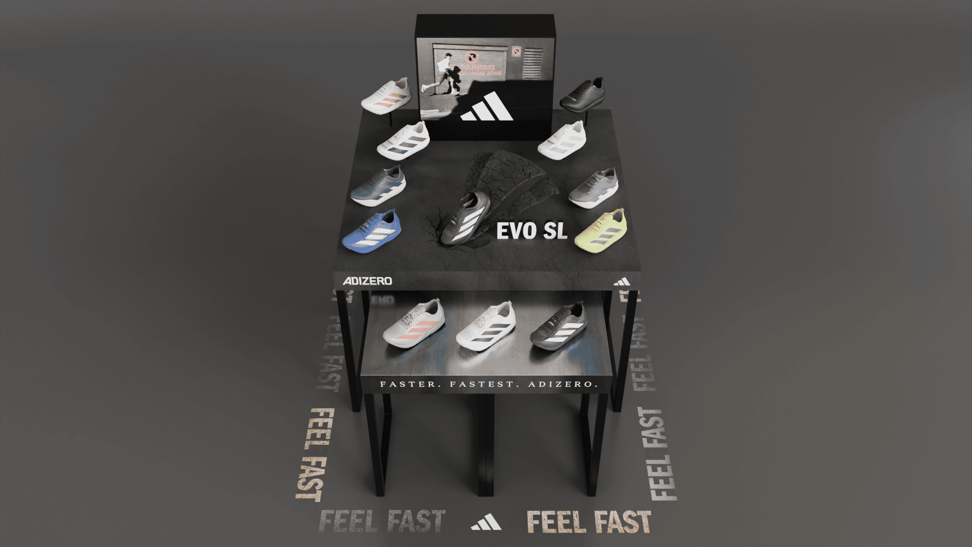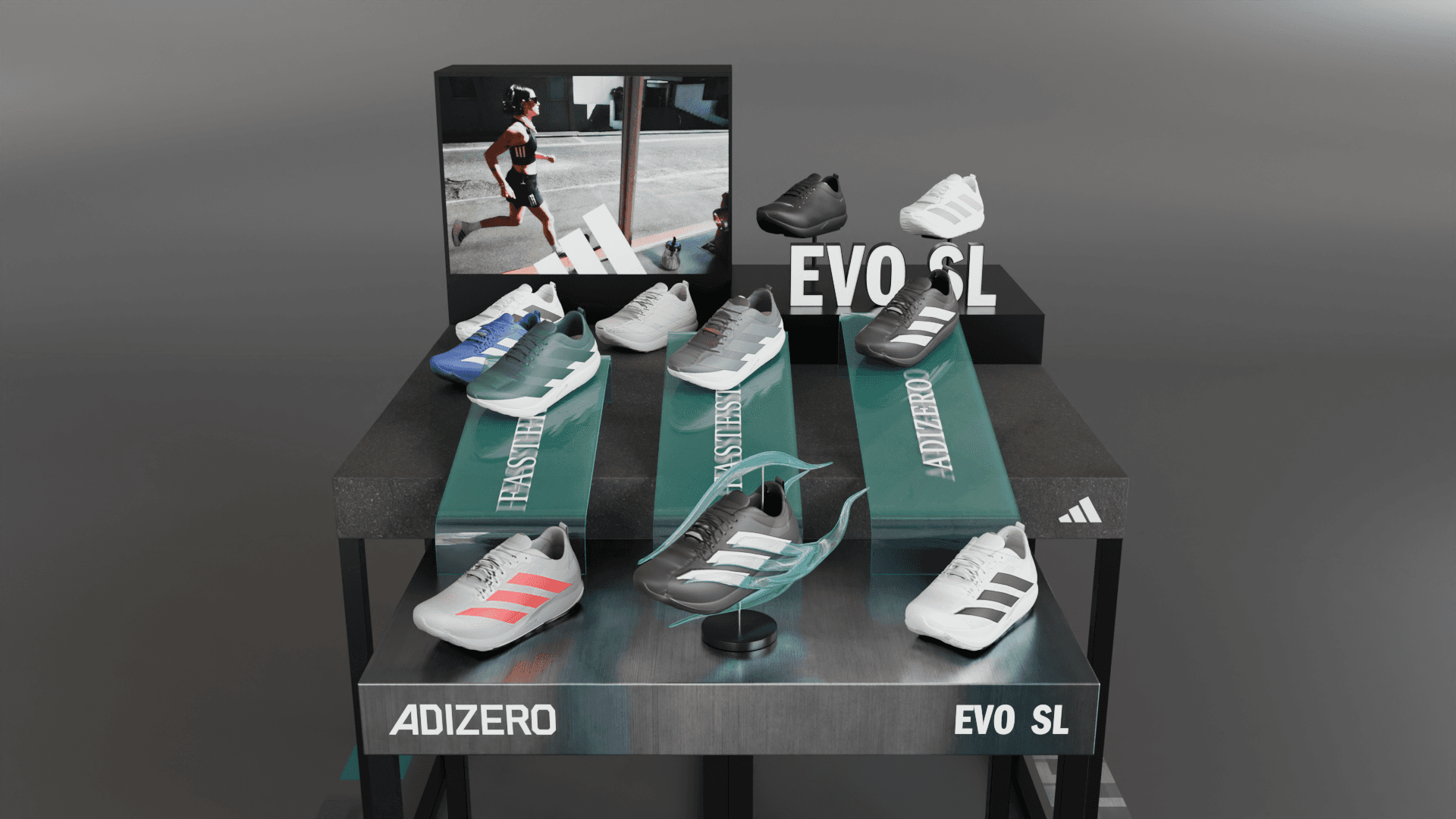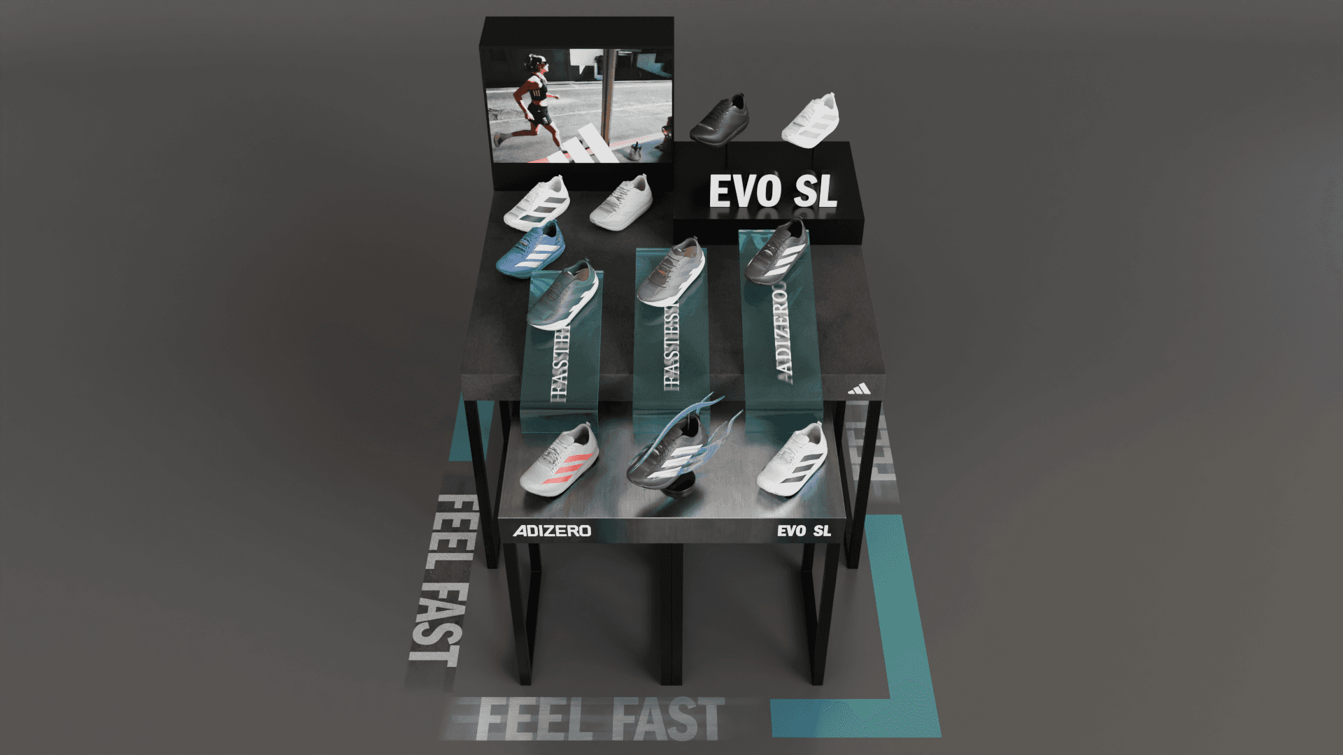 Adidas EVO SL shoe display table with sculptural elements and graphic concepts.