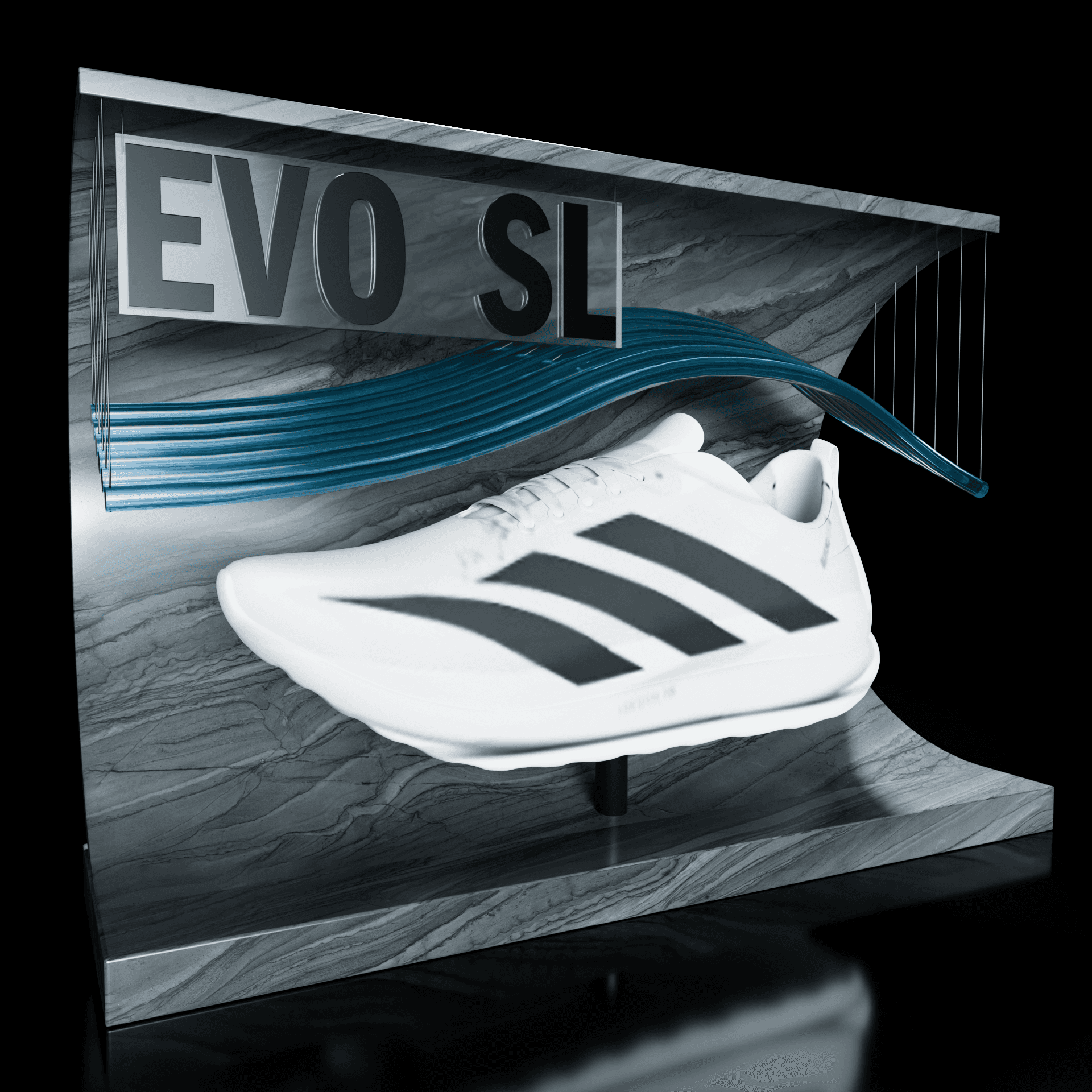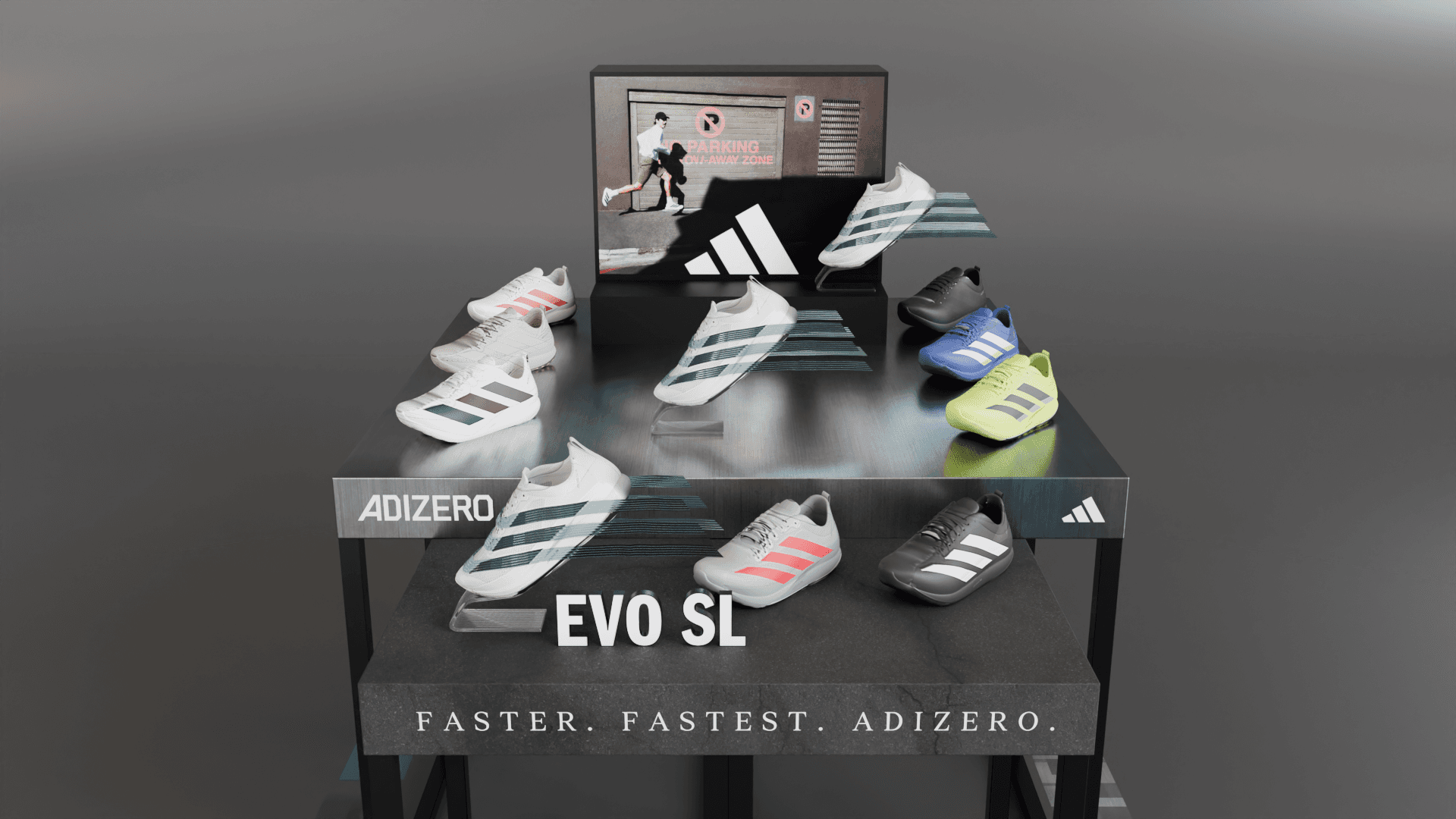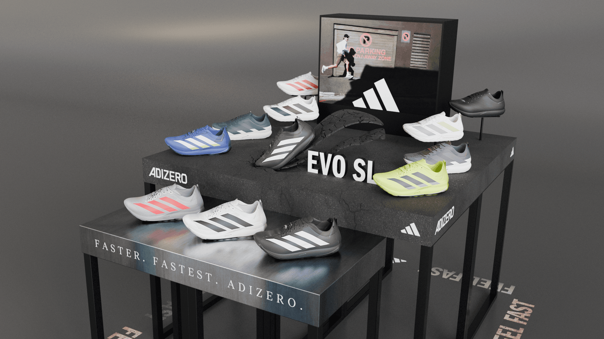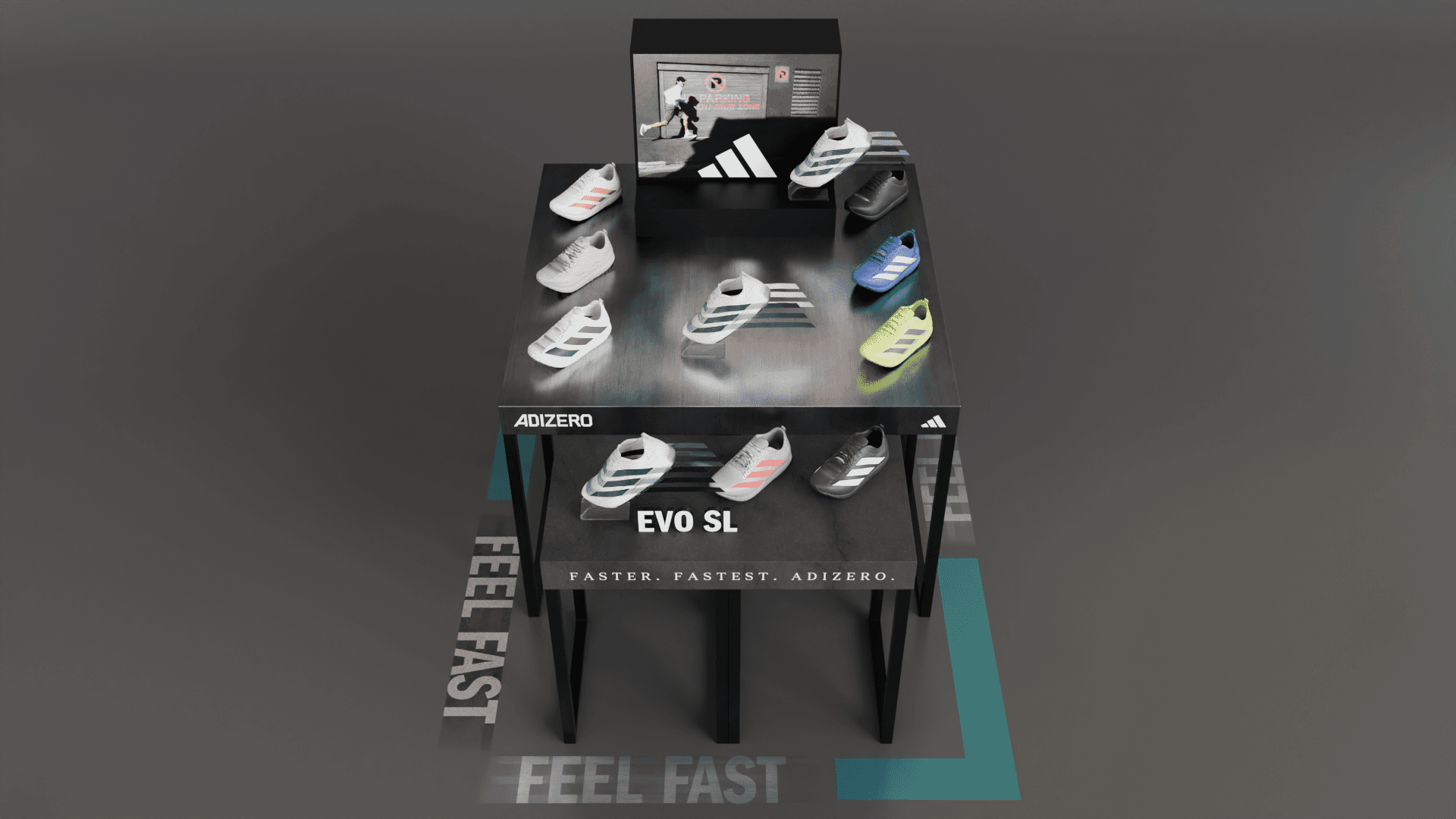 Adidas EVO SL shoe display table with sculptural elements and graphic concepts.