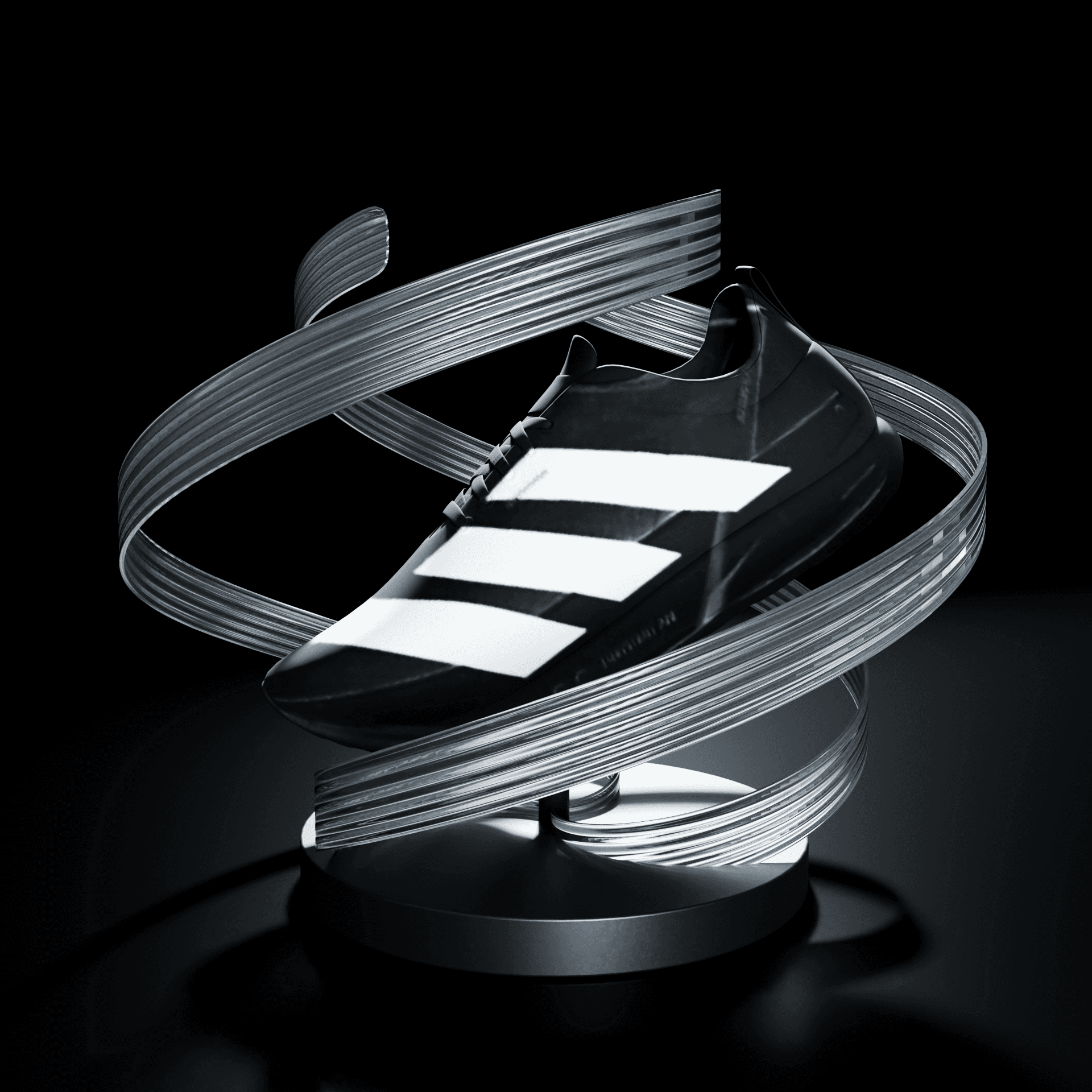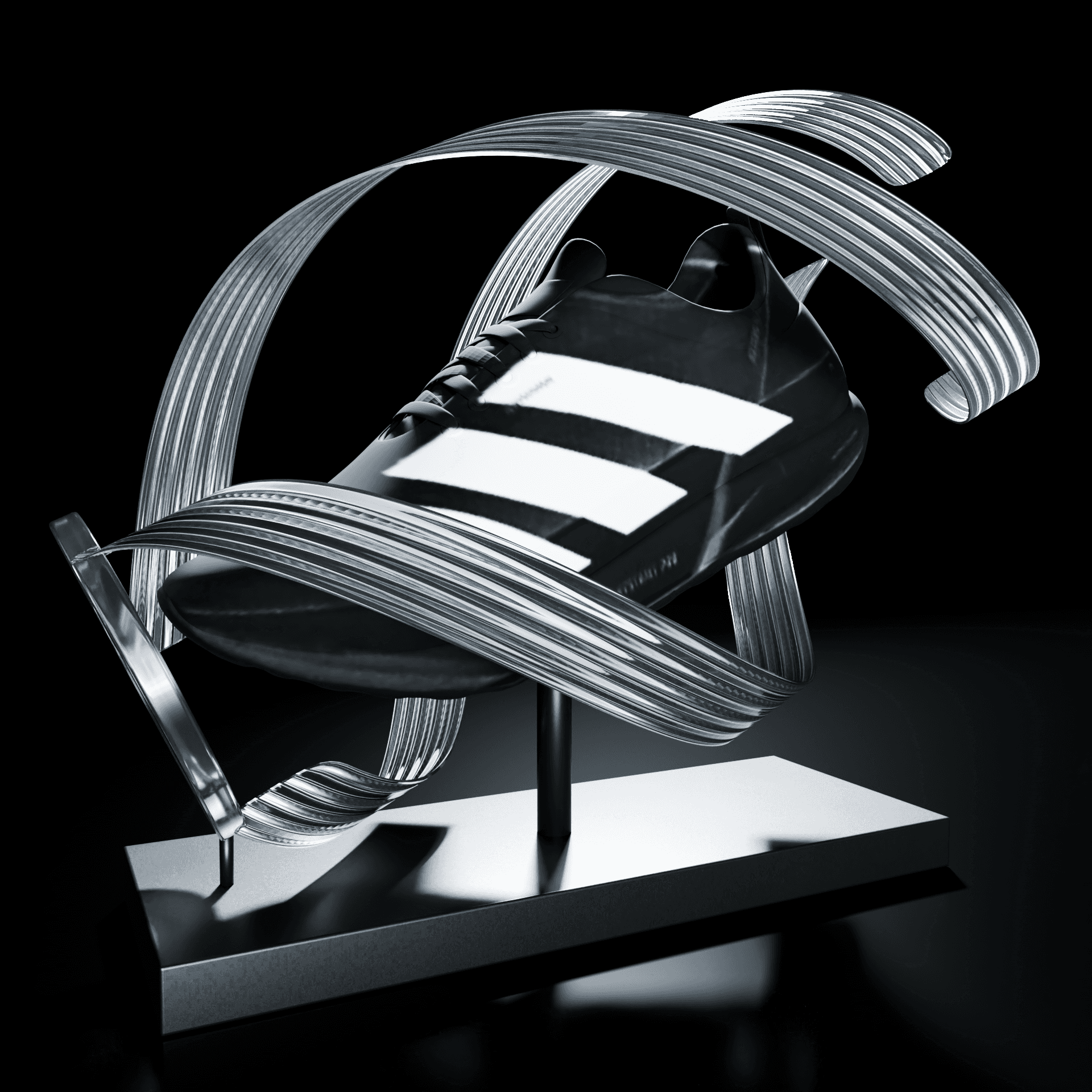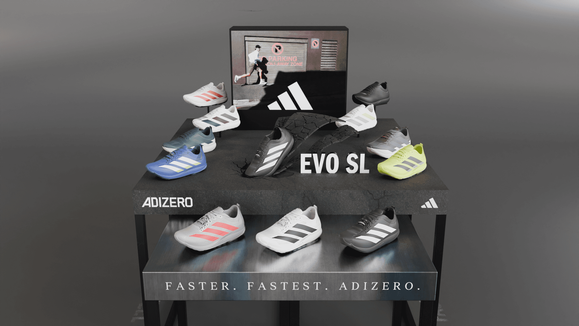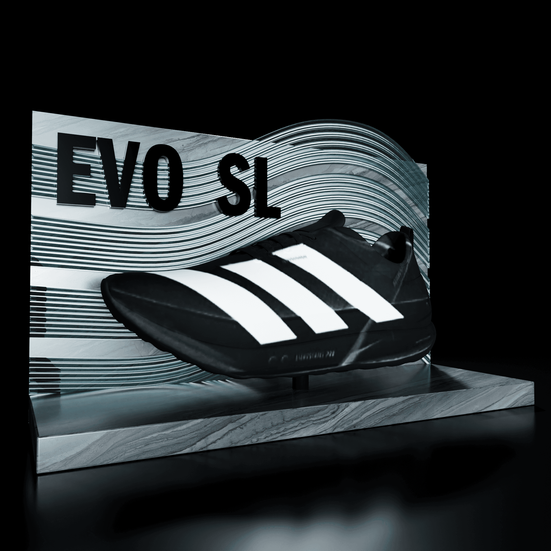 Adidas EVO SL shoe display table with sculptural elements and graphic concepts.