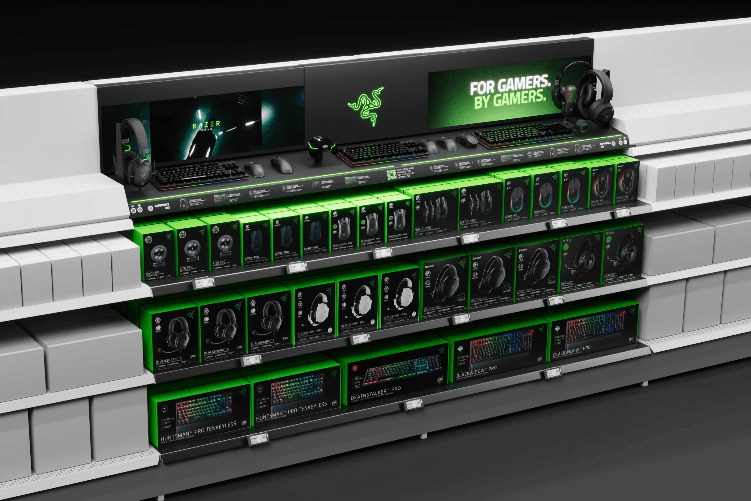 Razer 4ft interactive product display with integrated shelving.