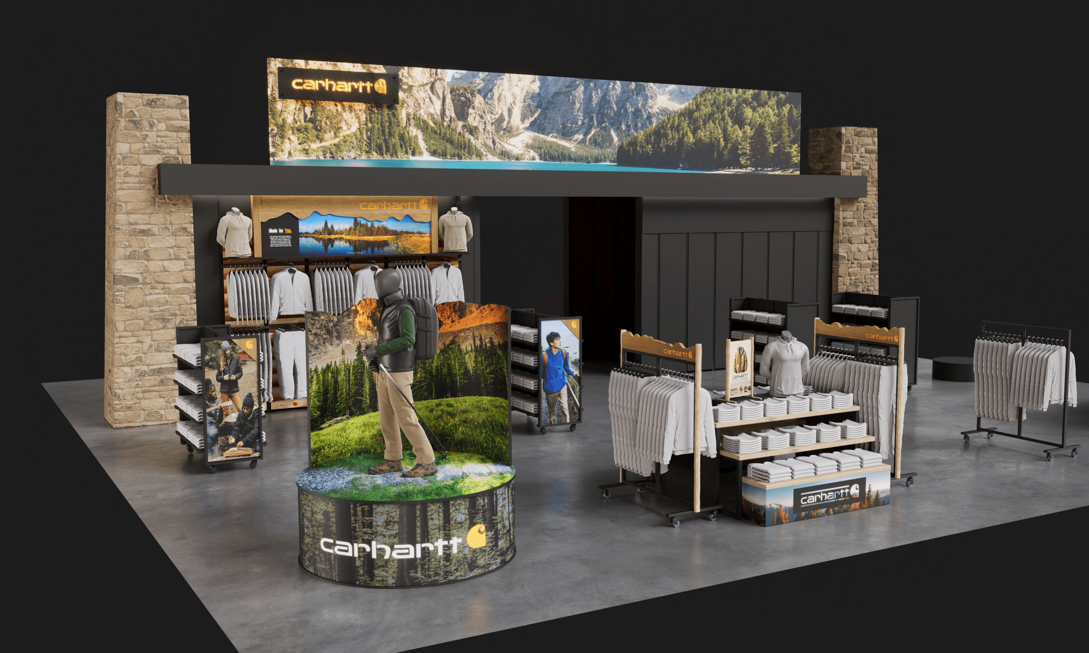 Carhartt shop-in-shop fixture system designed for Public Lands retail locations.