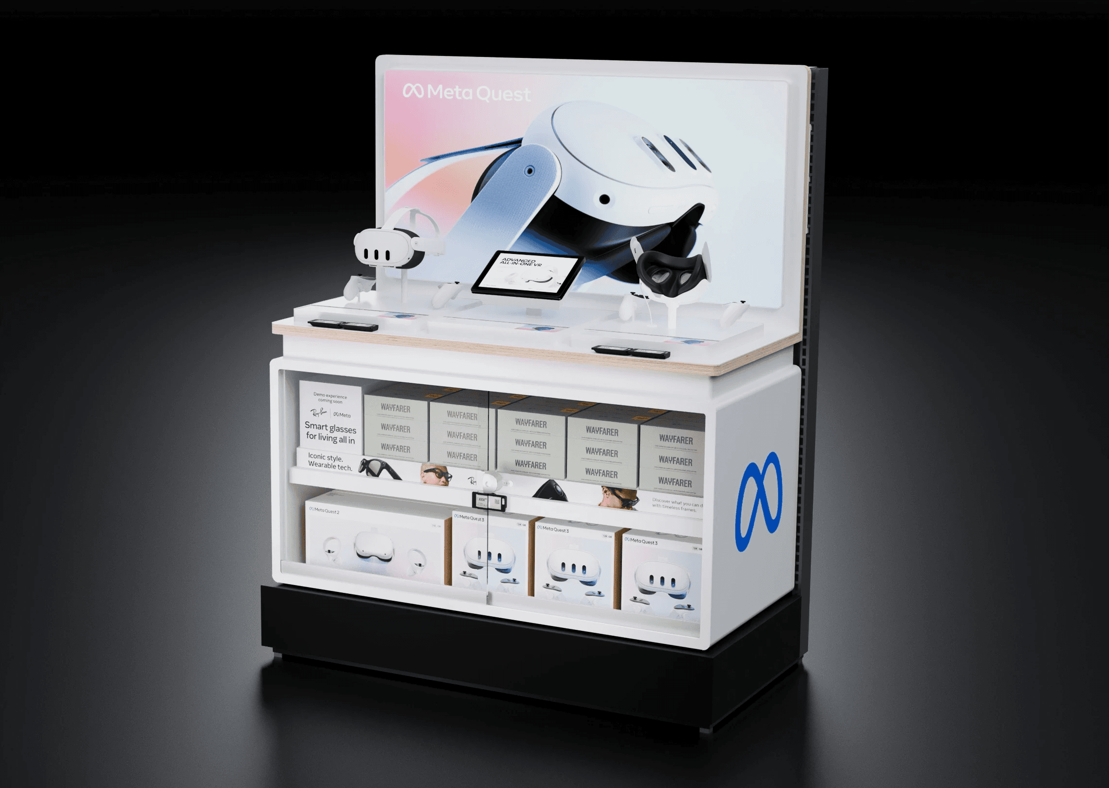 Display showcasing Meta's new Quest 3 and Rayban smart glasses collab.