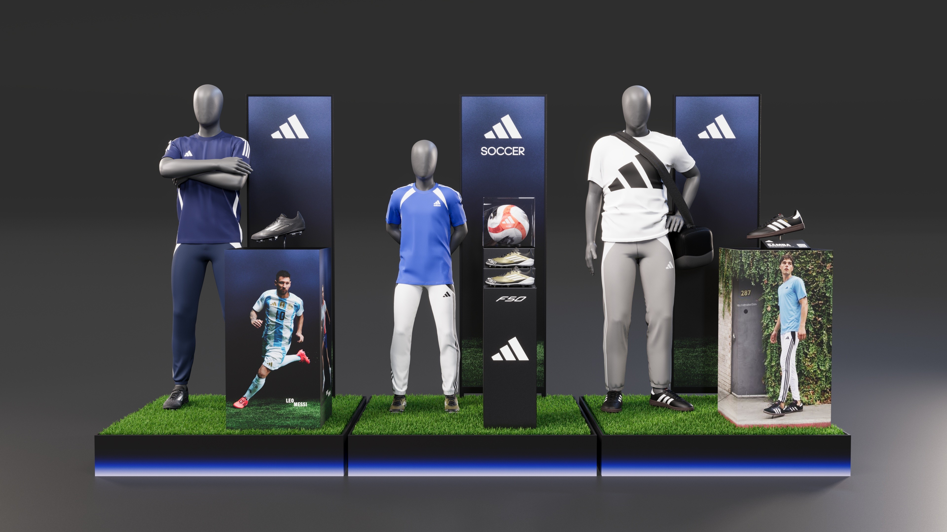 Adidas soccer mannequin display promoting apparel and footwear.
