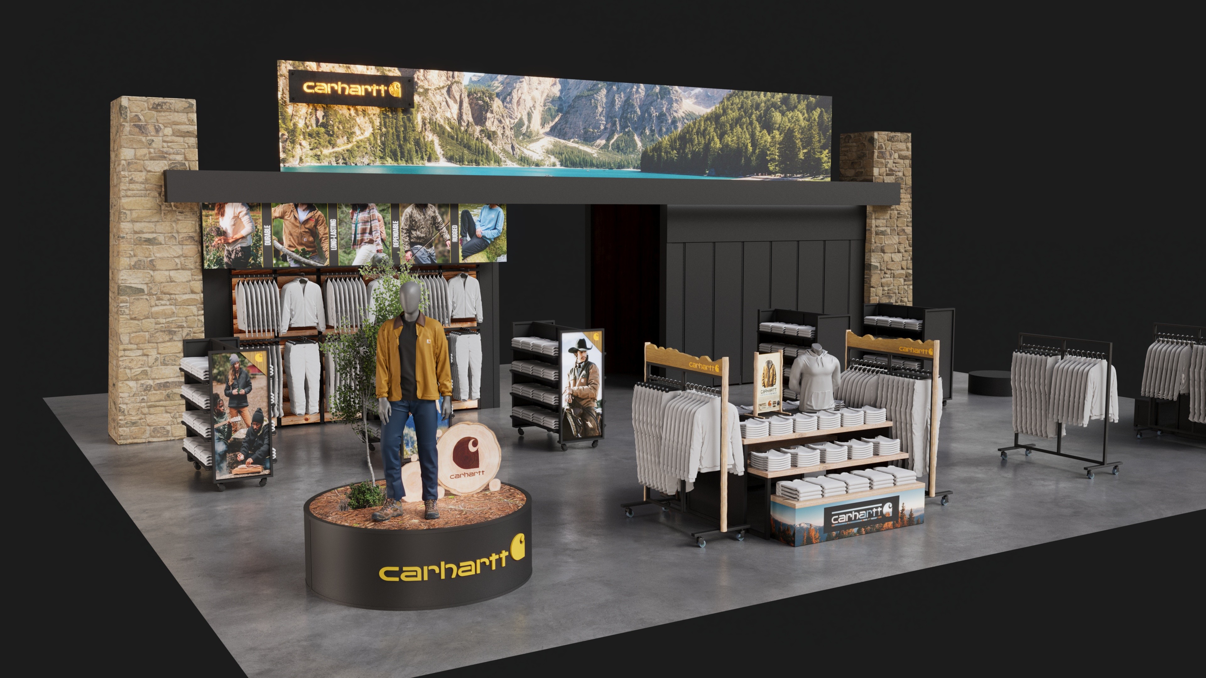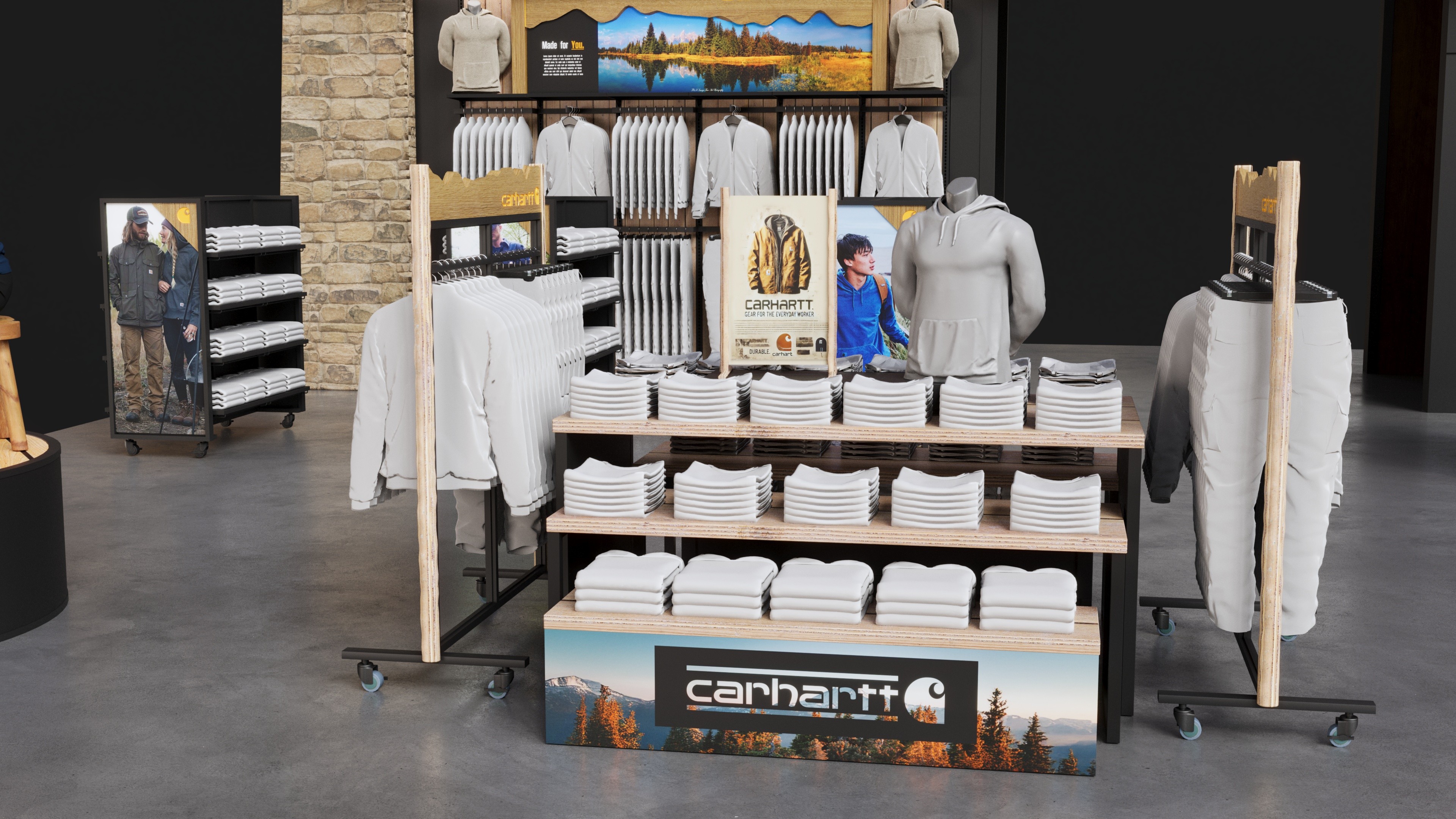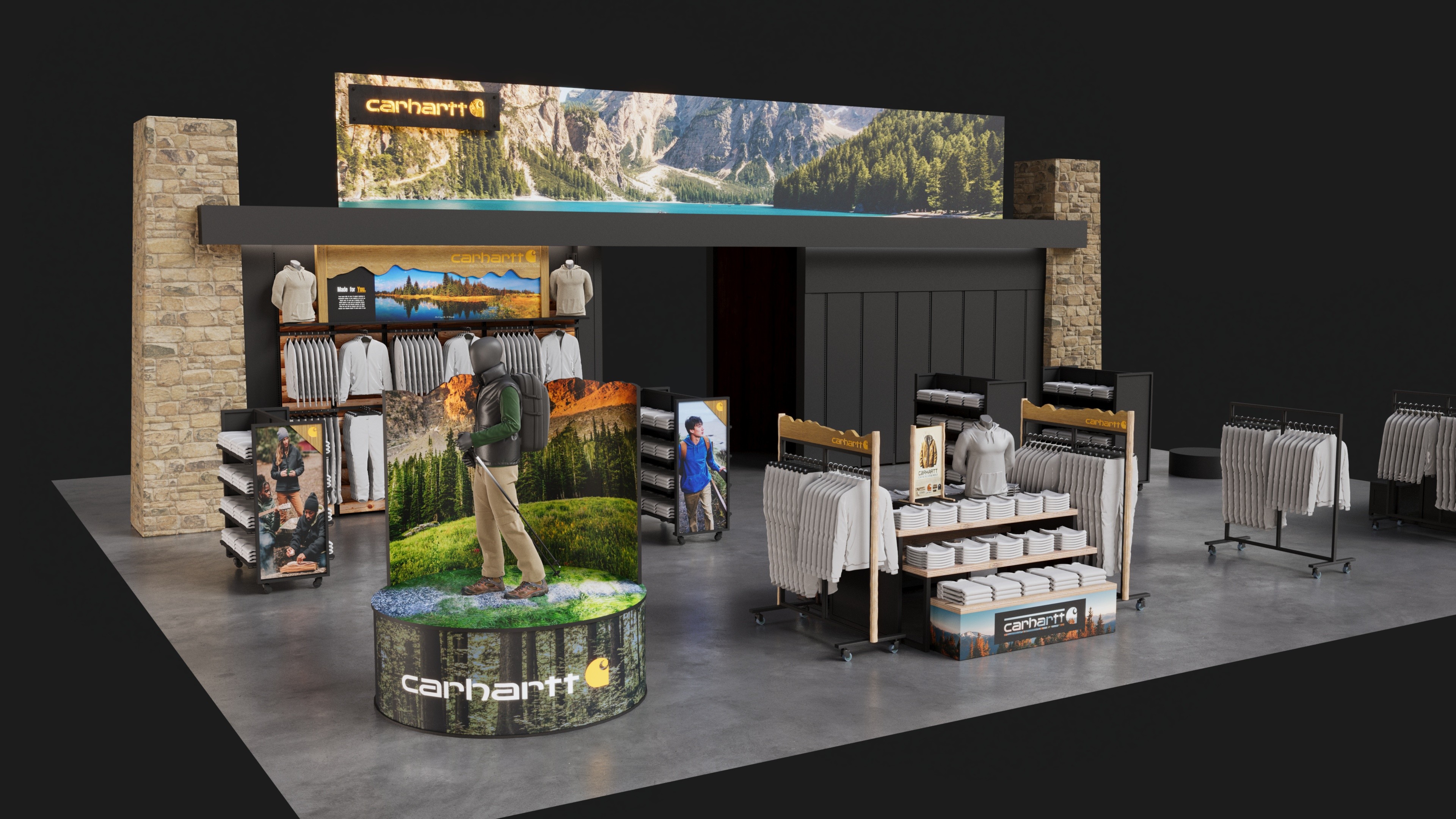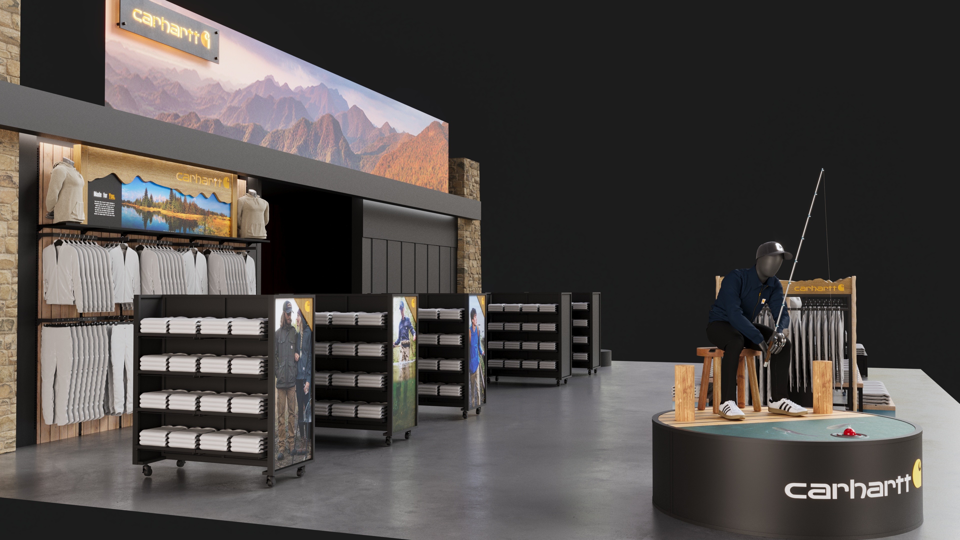 Carhartt shop-in-shop fixture system designed for Public Lands retail locations.