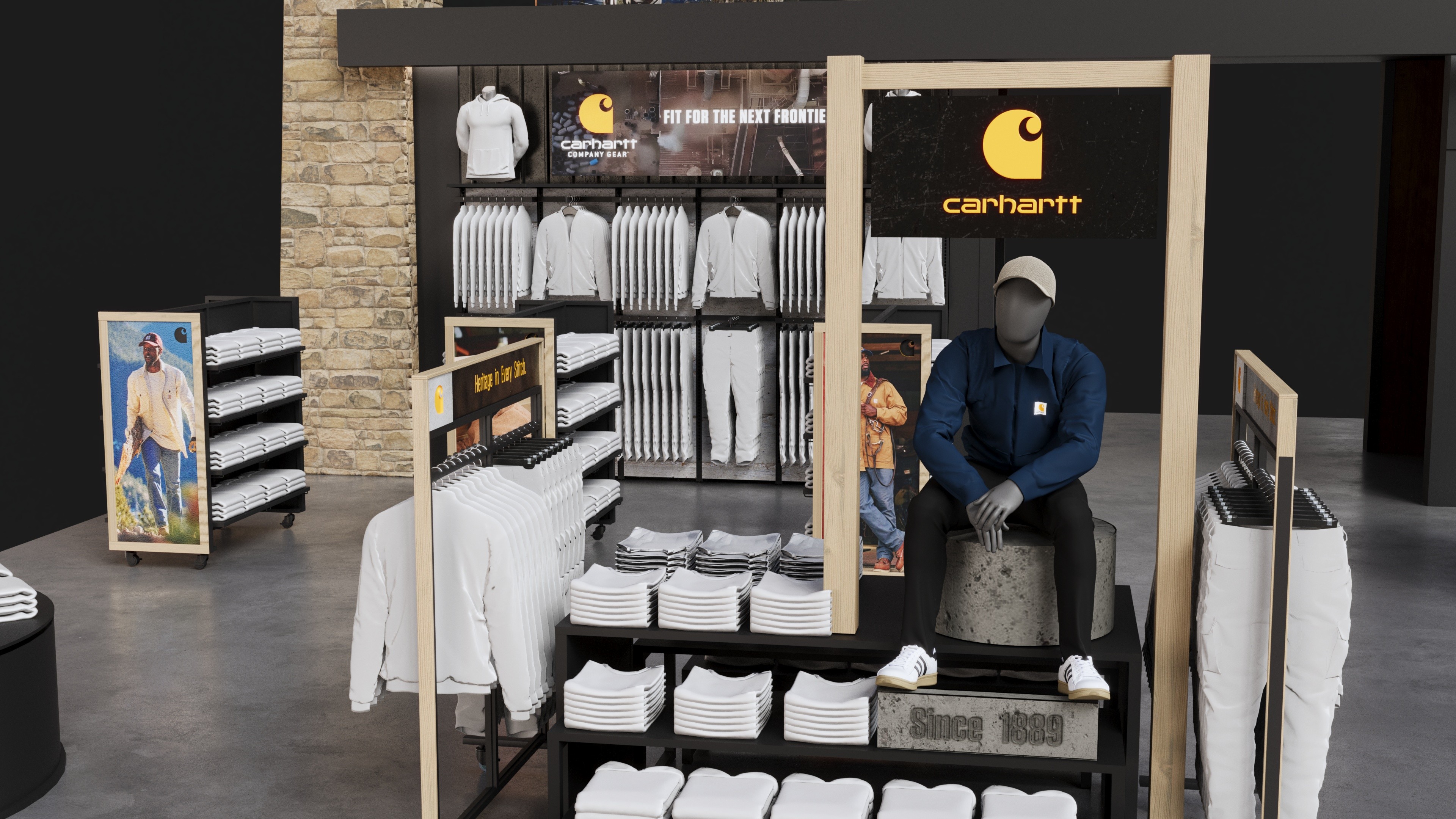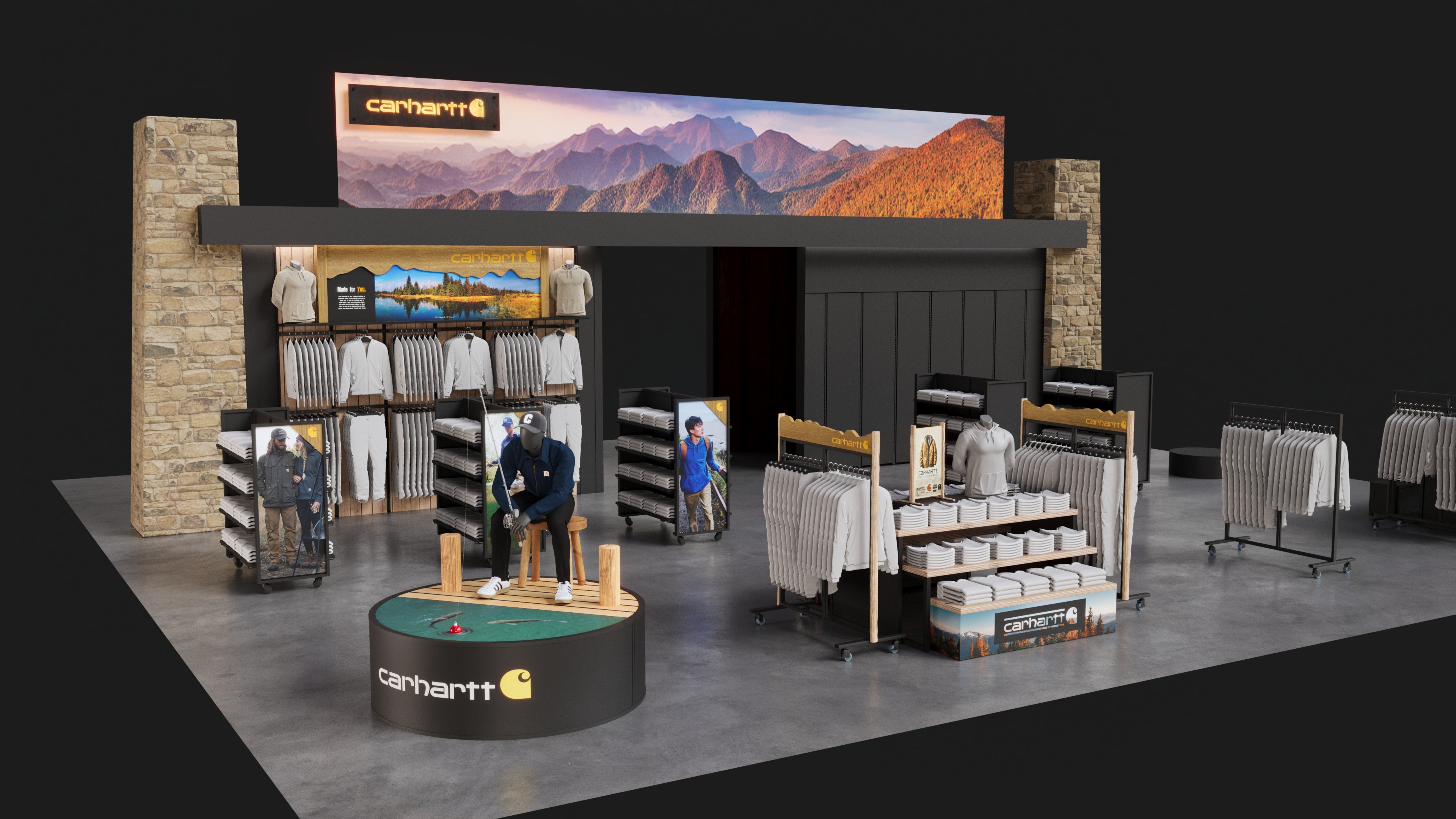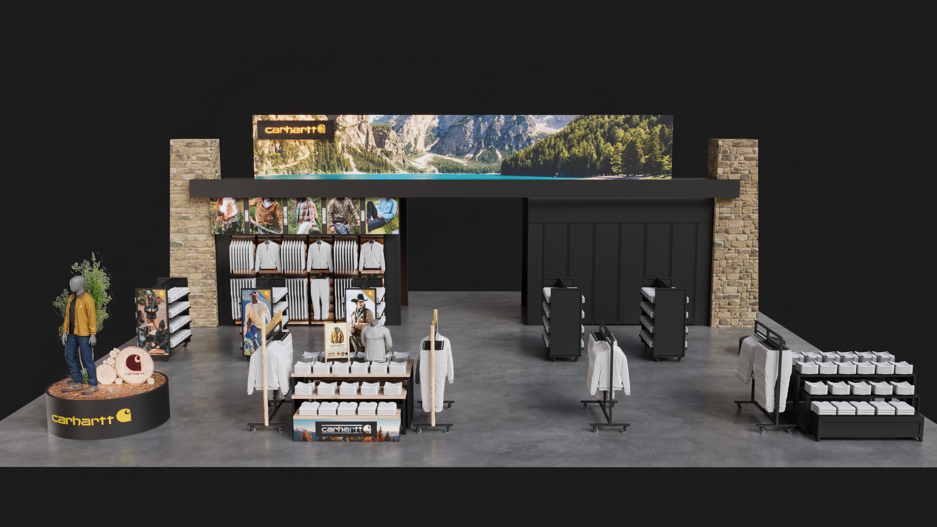 Carhartt shop-in-shop fixture system designed for Public Lands retail locations.