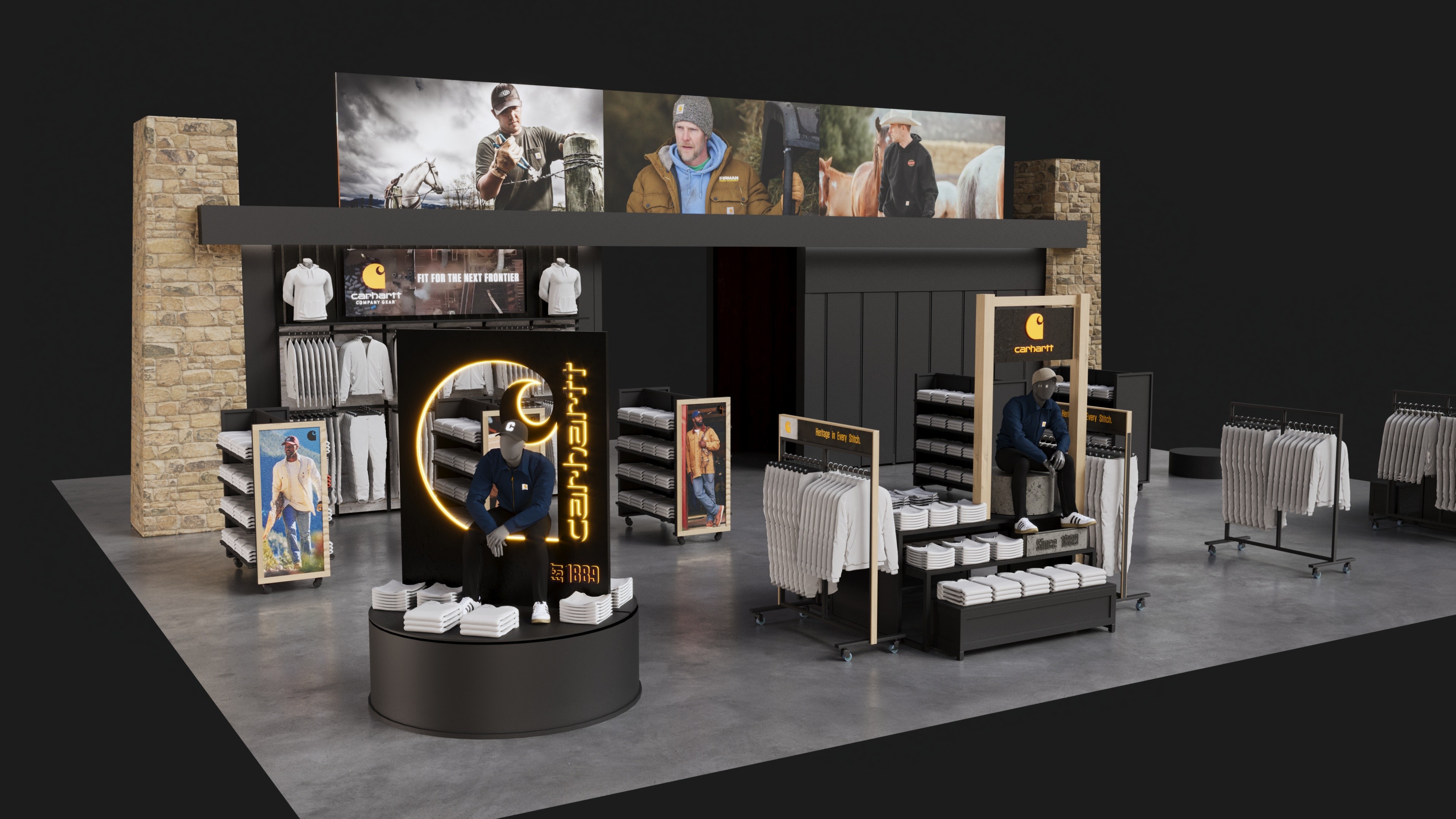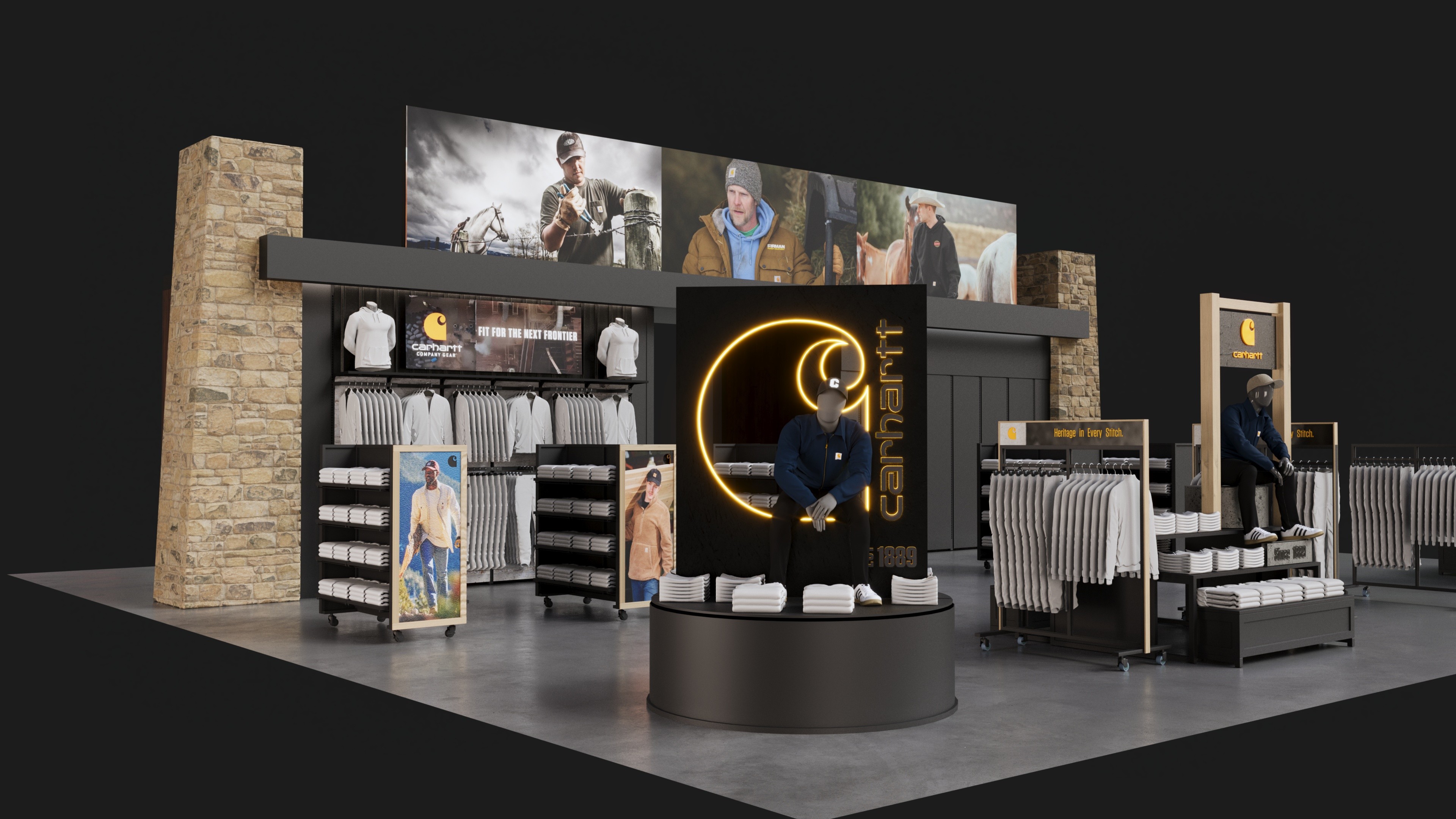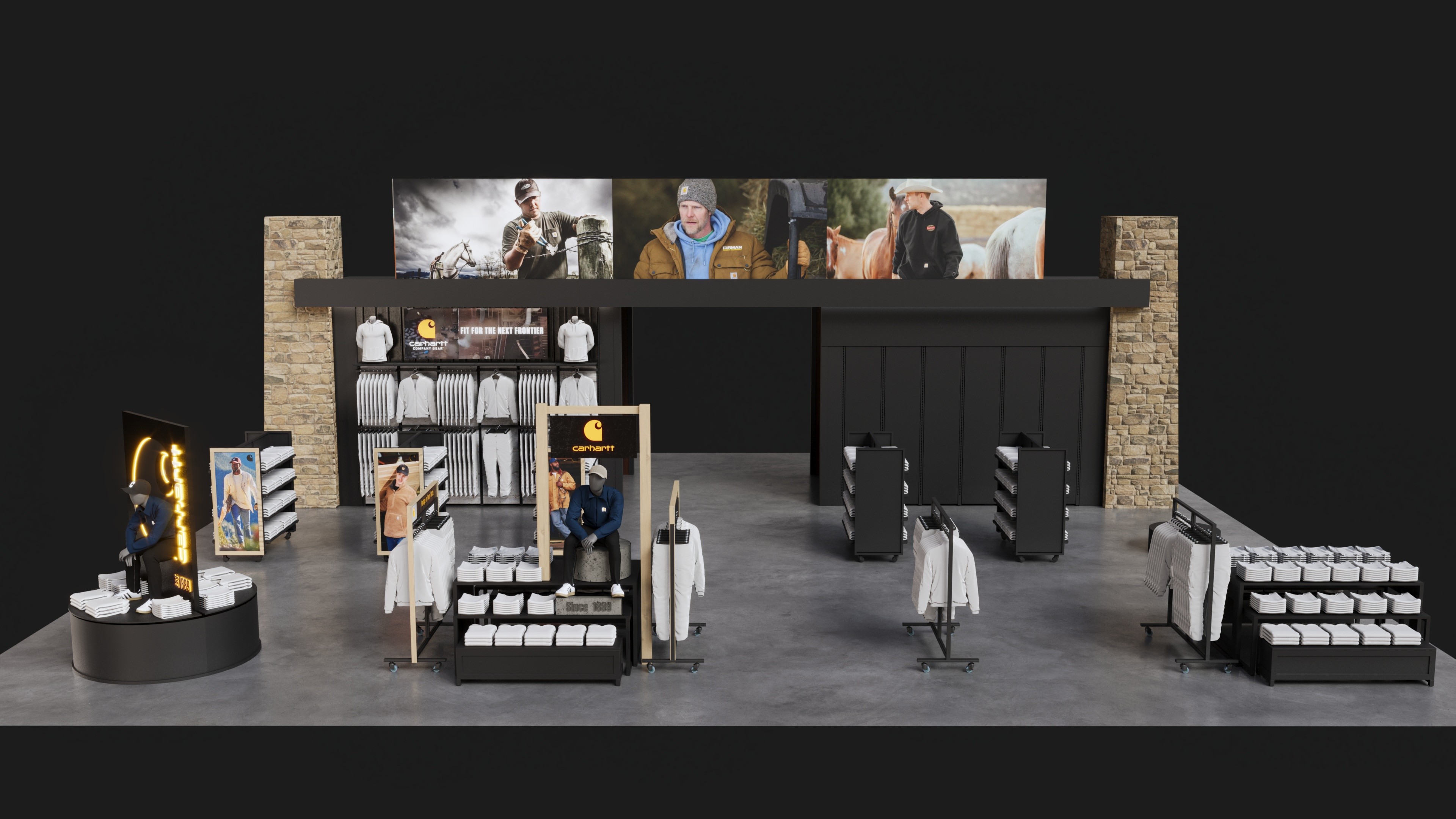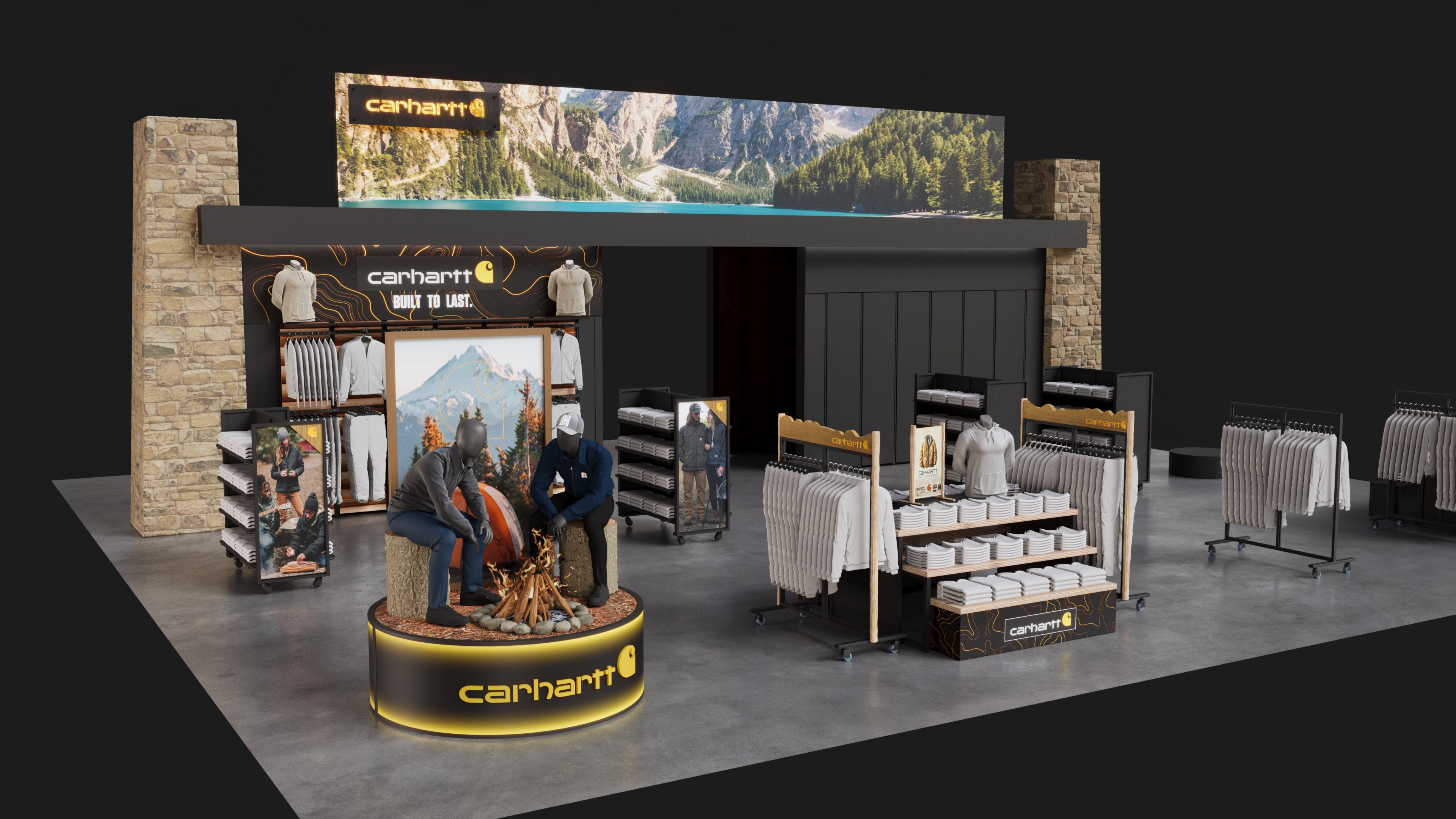 Carhartt shop-in-shop fixture system designed for Public Lands retail locations.