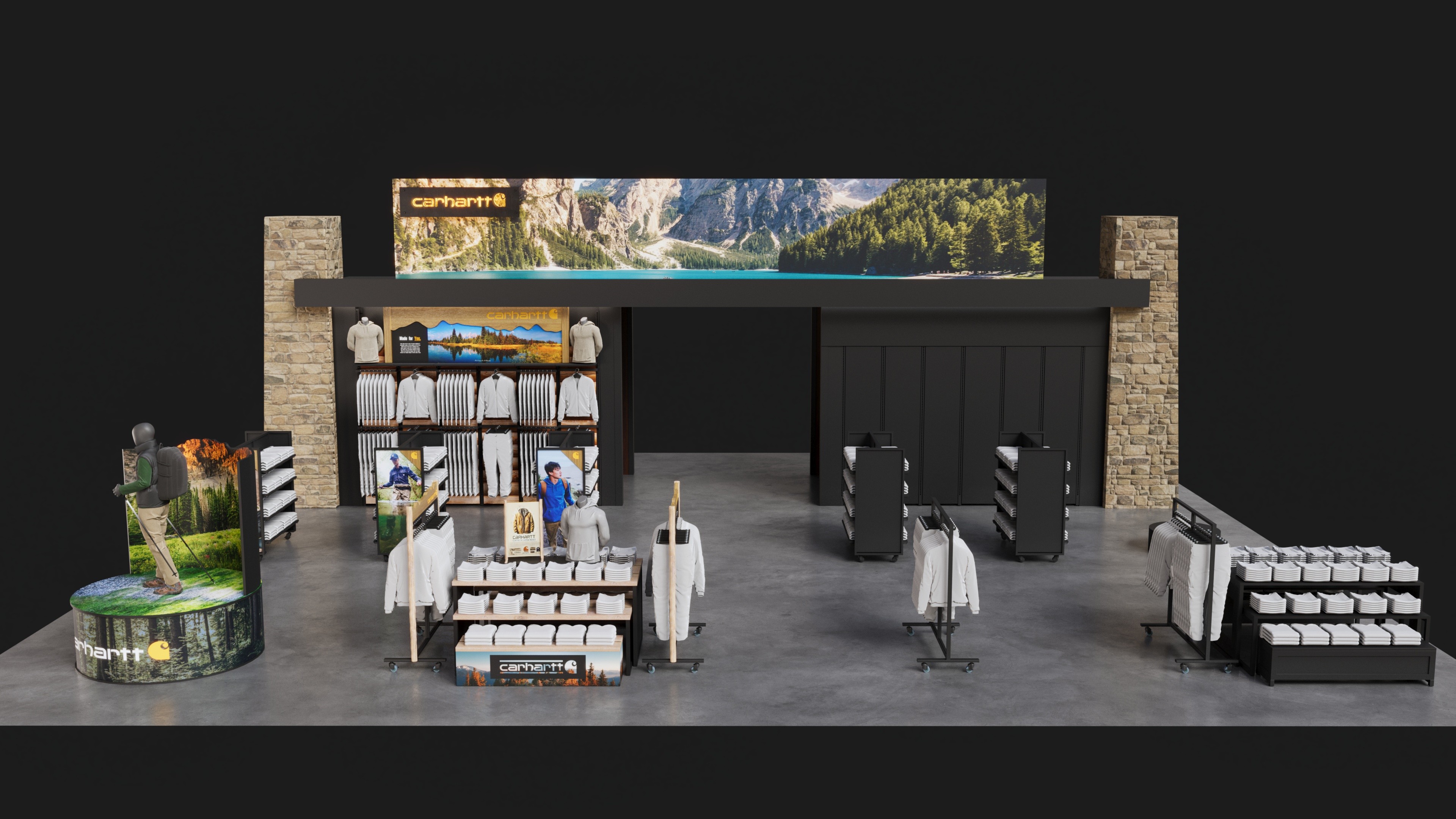 This project involved creating a set of design concepts for Carhartt’s men’s section within Public Lands stores. I developed several layout directions centered around a striking mannequin feature supported by a flexible kit of parts for fixtures, signage, and product presentation. The goal was to offer a cohesive visual identity that could adapt to different store footprints while maintaining a strong, authentic Carhartt presence.